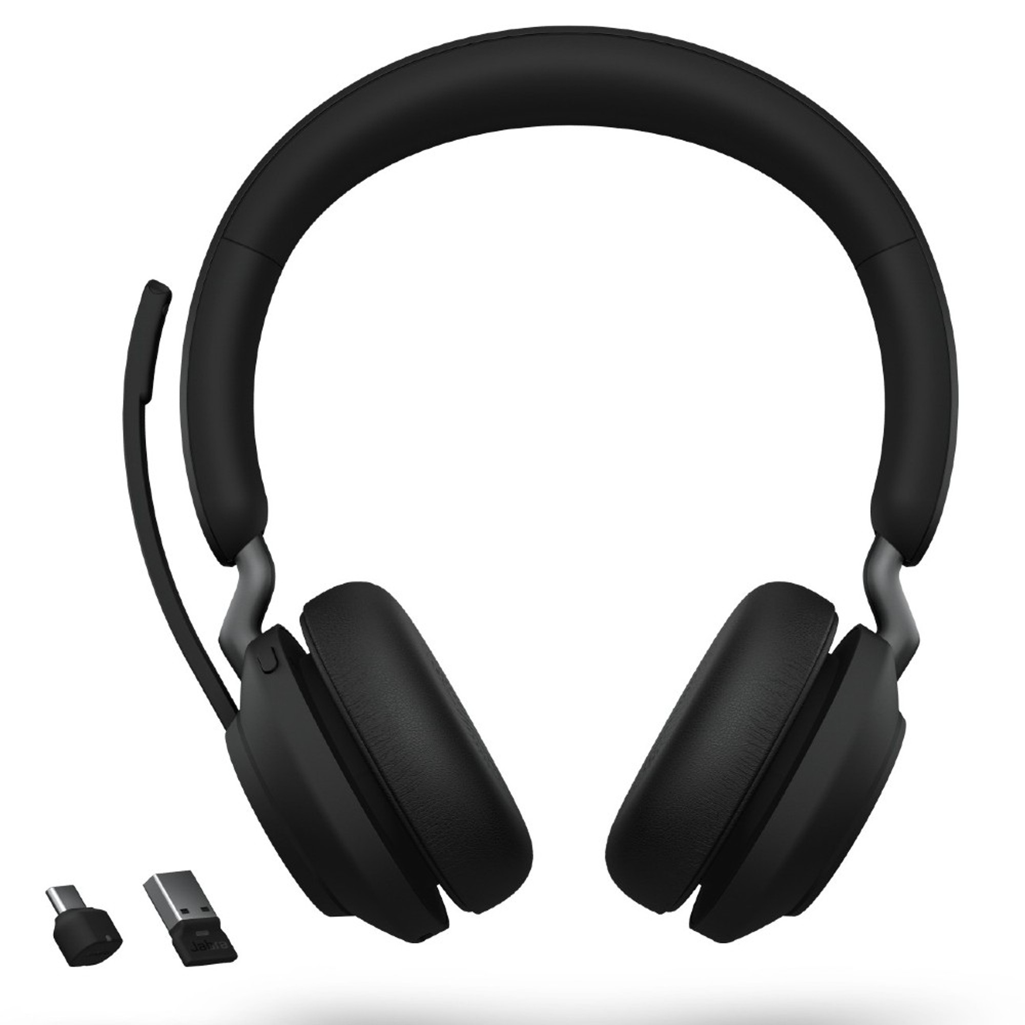 Communicate without distraction or wires with the Evolve2 65 Stereo Wireless On-Ear Headset from Jabra. Utilizing wireless Bluetooth technology and an included USB Type-A adapter, you can take important calls at your desk or walking the halls. To stay focused, Jabra incorporates isolating oval memory foam ear cushions and an angled earcup design to maximize passive noise isolation. A call can come at any time, which is why Jabra integrated a powerful battery that gives you up to 37 hours of power.