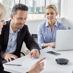 You can quickly pack the 7 oz speakerphone into its included pouch to take with you when traveling. It has a 4.72″ diameter and its lithium-ion battery is rated to provide up to 15 hours of talk time and can be fully recharged in about two hours. The speakerphone’s automatic power off feature helps to the battery’s standby time to over 200 days.