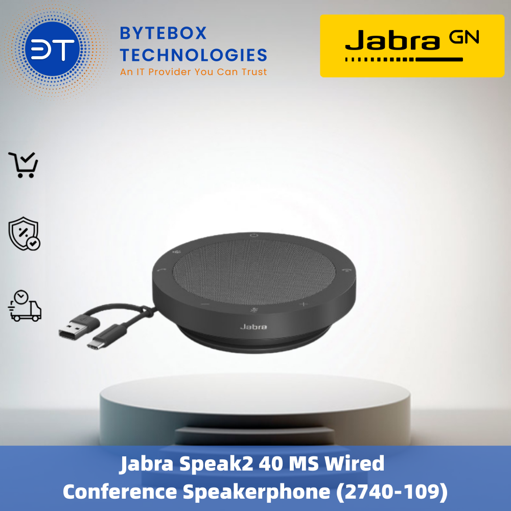 Equipped with four digital MEMS microphones, a built-in speaker, and a Microsoft Teams call button, the Jabra Speak2 40 Speakerphone is an ultra-portable solution for all of your conferencing needs. The unit is best suited for room sizes 14.76 by 14.76′. Full duplex audio with beamforming, noise-cancelling microphones ensure all participants are heard. Its plug-and-play configuration makes for easy setup with your Windows, ChromeOS, or macOS computer.